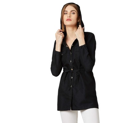 Women's Black Hooded Full Sleeves Solid Tie-Up Detailing Long Denim Jacket